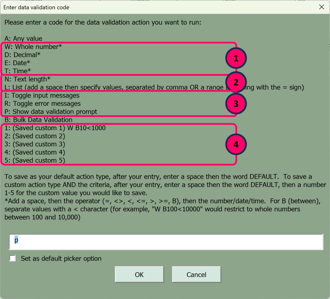 You can set your favorite or most commonly-used command as a default. The default is automatically entered and highlighted when the prompt is displayed. That way you can either just press Enter to run it, or press the key for a different option and Enter to run it – no mouse needed! Notice in the screenshot above, my default is F (for jump to first sheet) – something I use very frequently – especially when the first sheet is a table of contents! You can easily change the default over and over again based on your preferences. Many pickers also let you define custom options, such as your favorite fill colors, number formats, borders, etc.